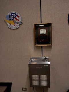 Over the water fountain in this control room--the same water fountain used during that time period--there's a framed plaque, with a mirror affixed to the top. The mirror came from the Apollo 13 module. The plaque reads:
